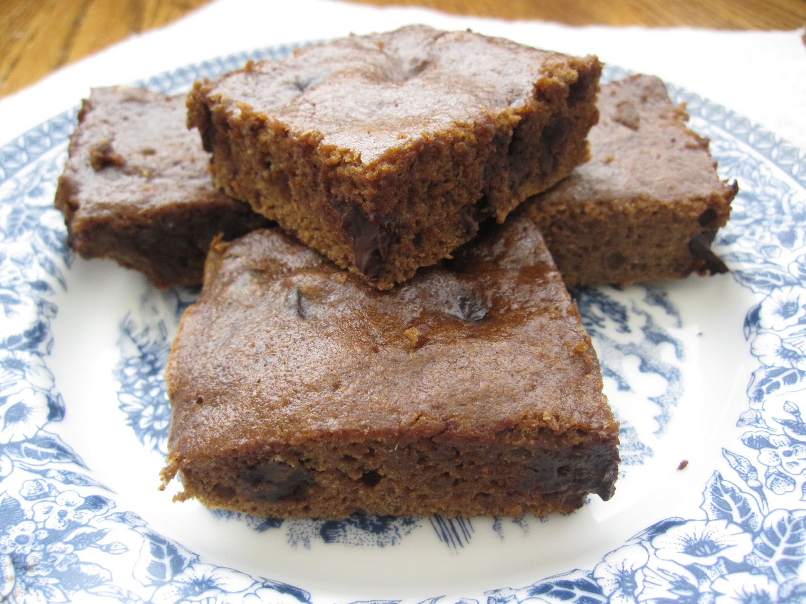 - In a separate bowl, mix together the flour, baking powder, cocoa powder, cinnamon, all-spice, nutmeg, salt and brown sugar. Add the the wet ingredients, and mix until fully incorporated. Fold in the chocolate chips.