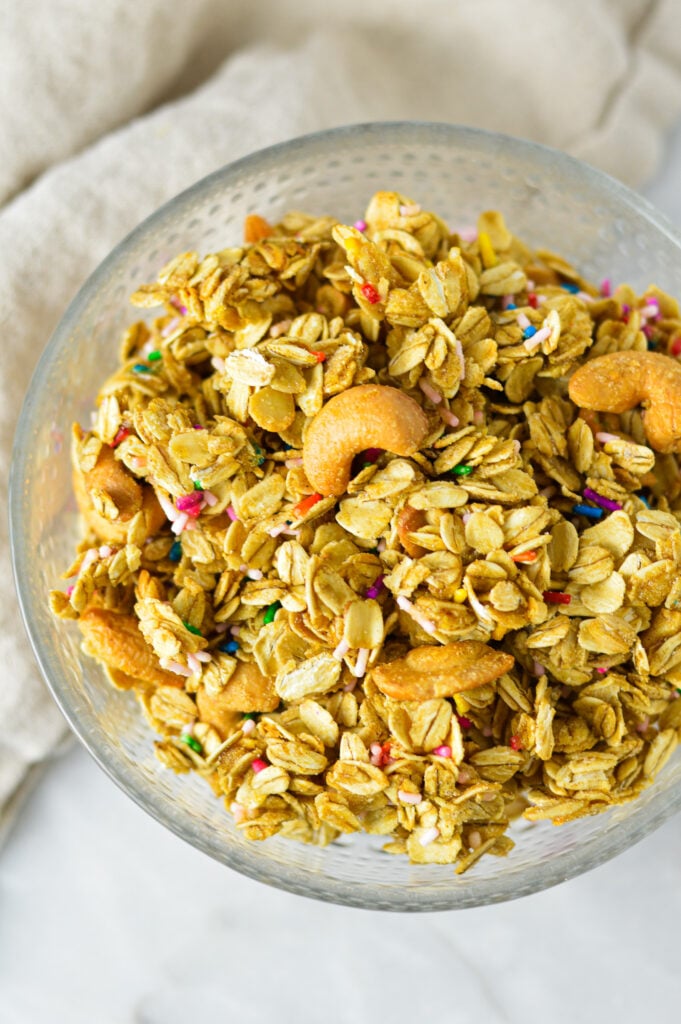 This homemade Funfetti Granola tastes like a birthday cake but in granola form! I love keeping them in a container for after school snacks with it too.