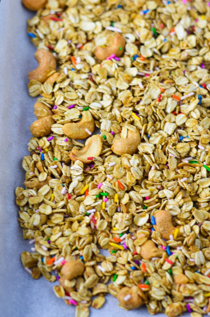 But I think this Funfetti Granola might be one of my favorites that I have made this month. The golden brown clusters of oats compliment the rainbow sprinkles perfectly. I love bringing a Tupperware container full of this granola to work, or keep it as fun snacks to have around the house when I am craving something sweet.