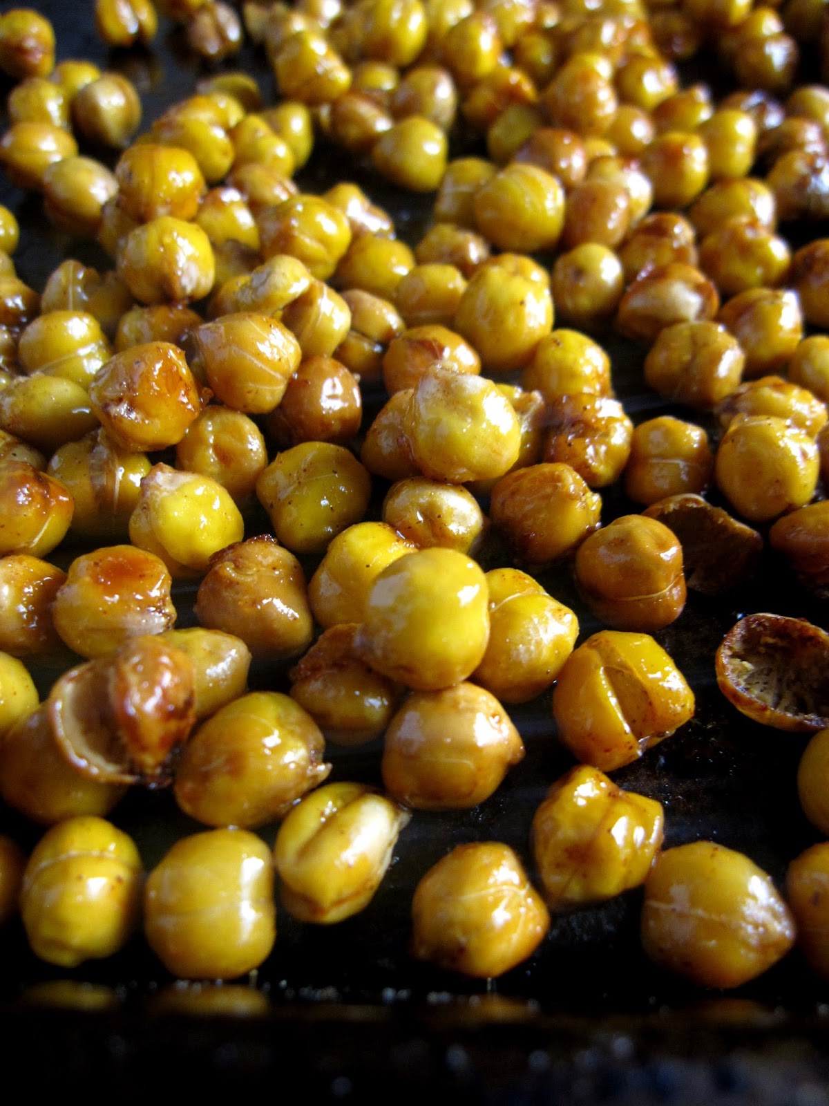 - Remove the chickpeas from the oven, and dump into the honey mixture. Mix to coat evenly, then pour onto the baking sheet again in one even layer.