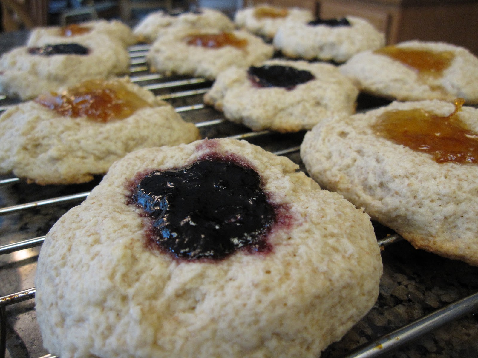 4. Form the dough into balls, and flatten the dough slightly with the bottom of a glass. Make an indentation in the centre of the dough. Fill the indentation with jam, and bake for 12-15 minutes. Let cool on wire racks.