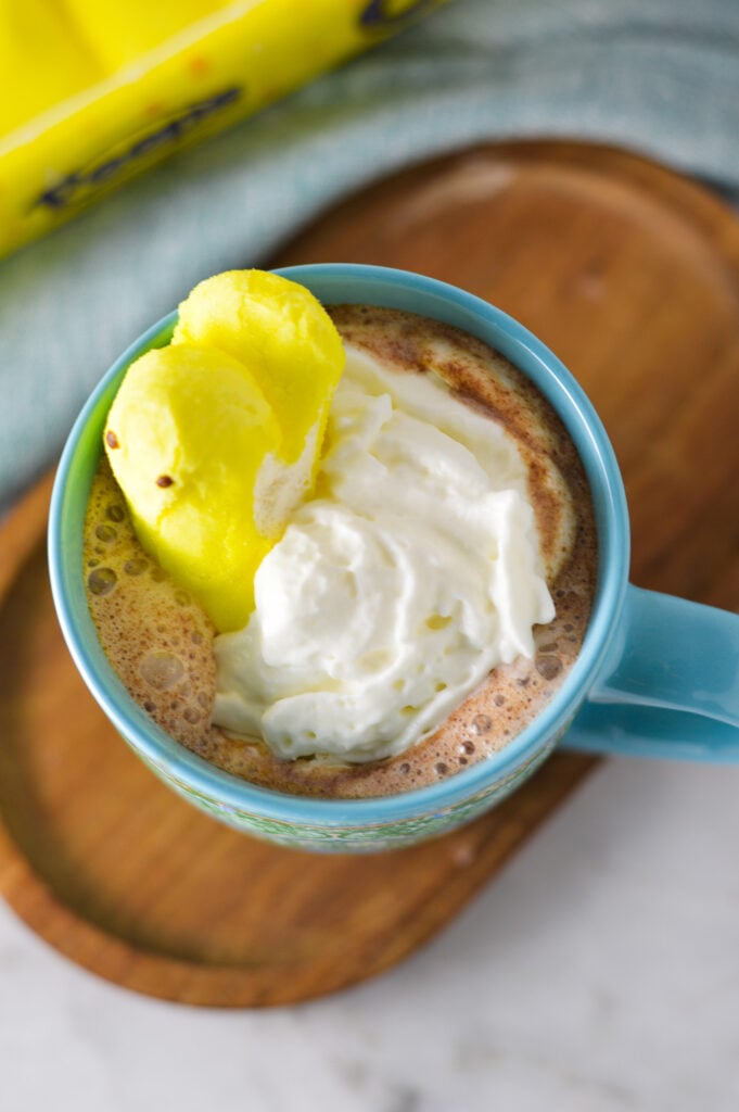 - Pour into a mug and top with whipped cream and extra Peeps, if desired.