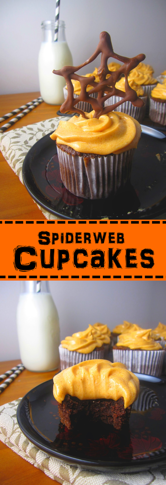 - Spiderwebs: In a microwave safe bowl, melt the chocolate in 30 second intervals, stiring until the chocolate is melted. Pour the chocolate into a large freezer bag. Place some wax paper on a baking sheet. Cut the end off of the freezer bag, and pipe the chocolate onto the wax paper, creating your spider webs. Freeze until hard, then place on the cupcakes.