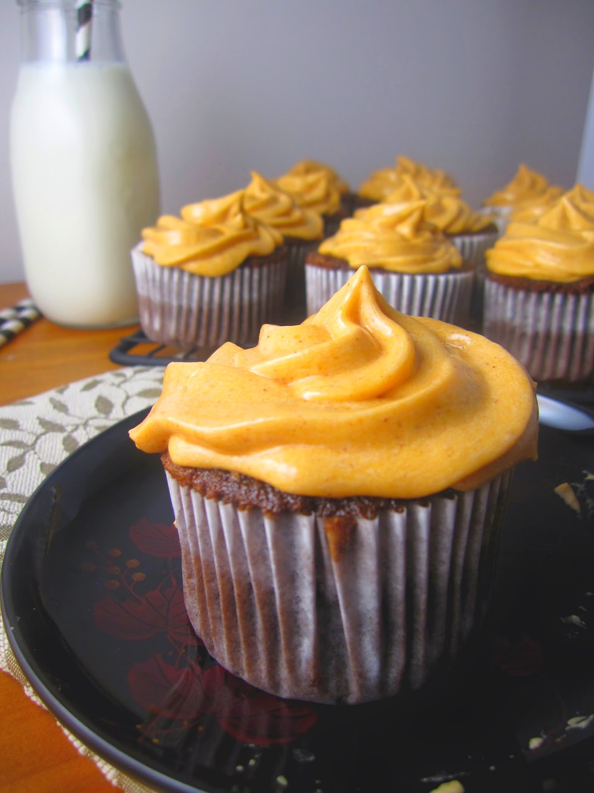 Other than deliciously orange frosting, I just see a regular cupcake. But what does my boyfriend see? “Too much icing” he claims. Armed with a butter knife, whenever he takes a cupcake I catch him scraping half of the icing into the garbage.