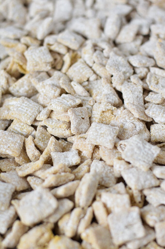 - Scoop the Chex mixture in the bag with the powdered sugar. Close the bag and shake until the Chex is fully coated in powdered sugar. You may need to press on the bag to separate clumps.
